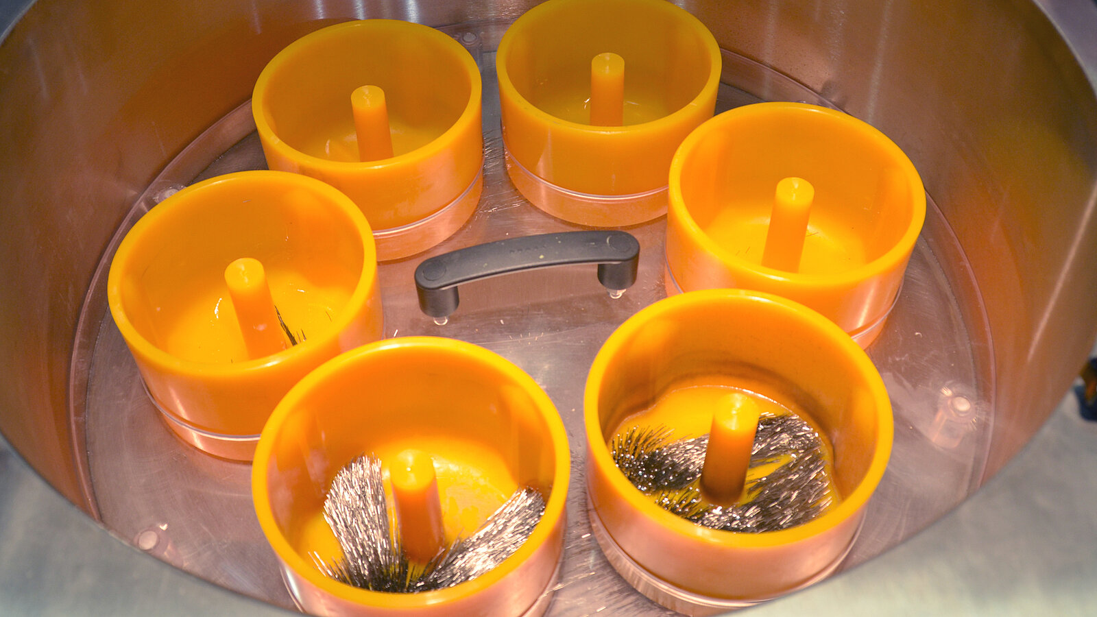 Ein sehr schnell rotierendes Magnetfeld bringt magnetisierbare Inox-Stifte in Bewegung, sodass diese die Teile sehr intensiv aber schonend bearbeiten.